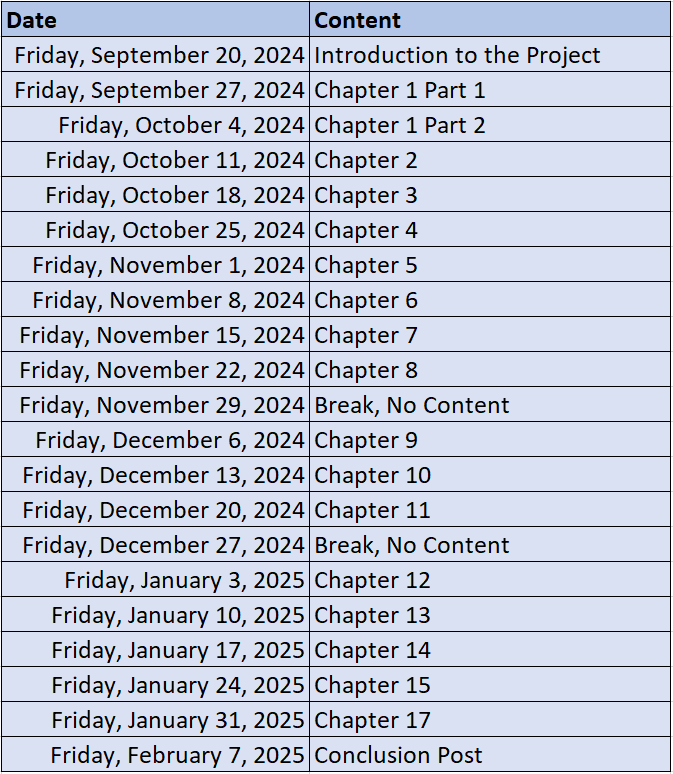 Each weekly post will contain an analytic breakdown of the corresponding chapter. I expect each chapter to take a full week, but the first chapter will take two weeks since there will be so much to cover. Each post will cover things like character profiles, story elements, interesting vocabulary, plot drivers, and other linguistic nuances that are worth attention.